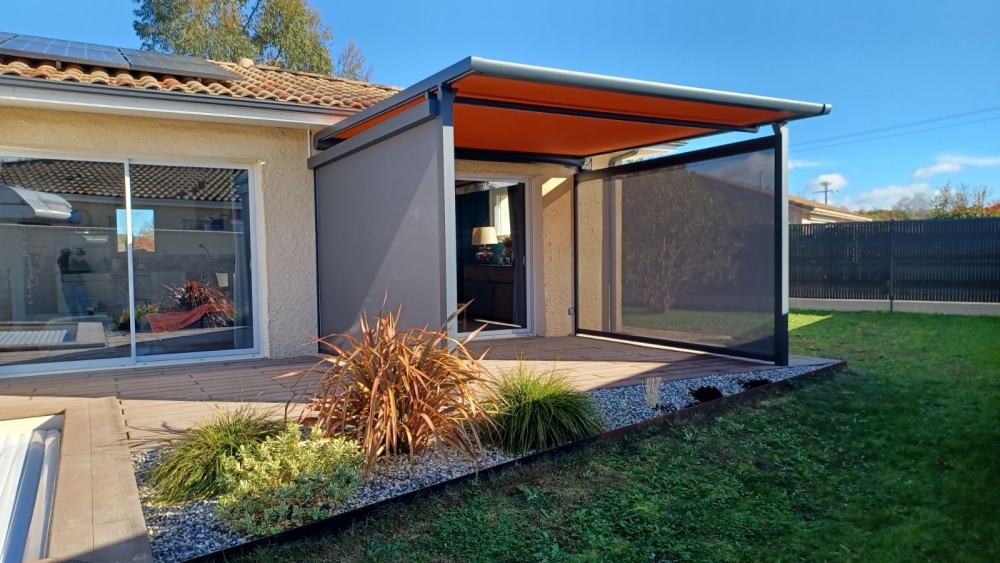 Et oui, même en automne Bel Porte Menuiseries installe des protections solaires!! Nous avons posé chez notre client de Mont de Marsan, une pergola avec toile rétractable et screens sur les côtés.